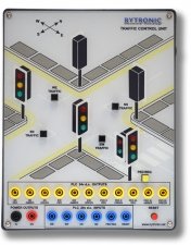 The TCU represents a typical crossroads junction controlled by two pairs of traffic lights together with a pedestrian crossing on one approach. The TCU features a clear mimic of a traffic junction with the lights and pedestrian crossings represented by LED’s in the appropriate colours. Four buttons are used to simulate vehicle sensors built into the surface of the road and represent traffic flow. Further buttons are used to control the pedestrian crossing and a reset signal.