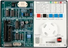 ViewThe Washing Machine Simulator (WMS) is an application for electronic control engineering. The unit incorporates a series of input and output devices, which together simulate the actions of a typical domestic washing machine. The WMS has two main areas. The first area comprises the electronic circuits and connector sockets, the second area is the indicators, a motorised disc (which represents the washing machine drum) and the user controls. The circuit board incorporates test points, a fuse and four switches for fault insertion.
