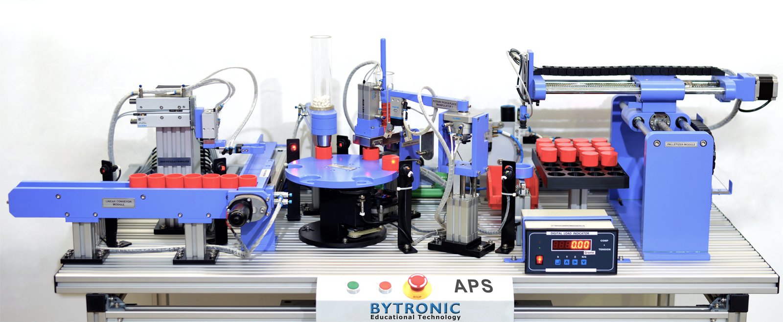 The APS is constructed on an aluminium frame and can be mounted on a bench or supplied with a support stand. The APS has an operating console with on/off switches, emergency stop switch and PLC control with the I/O connections, electrical and pneumatic.