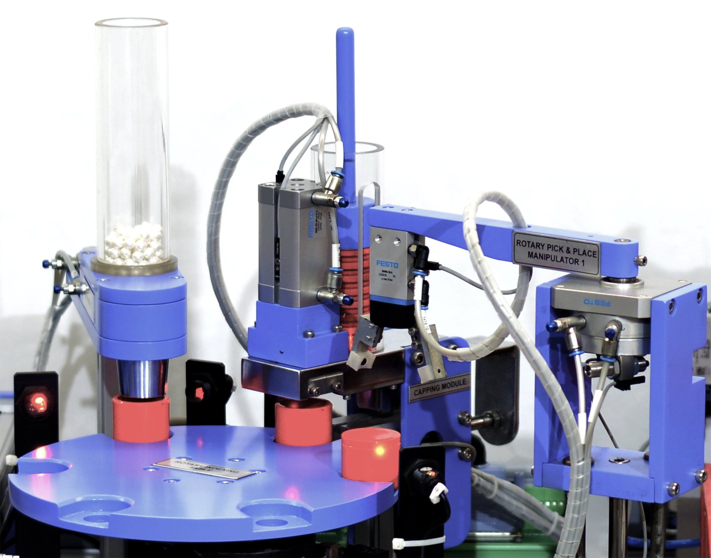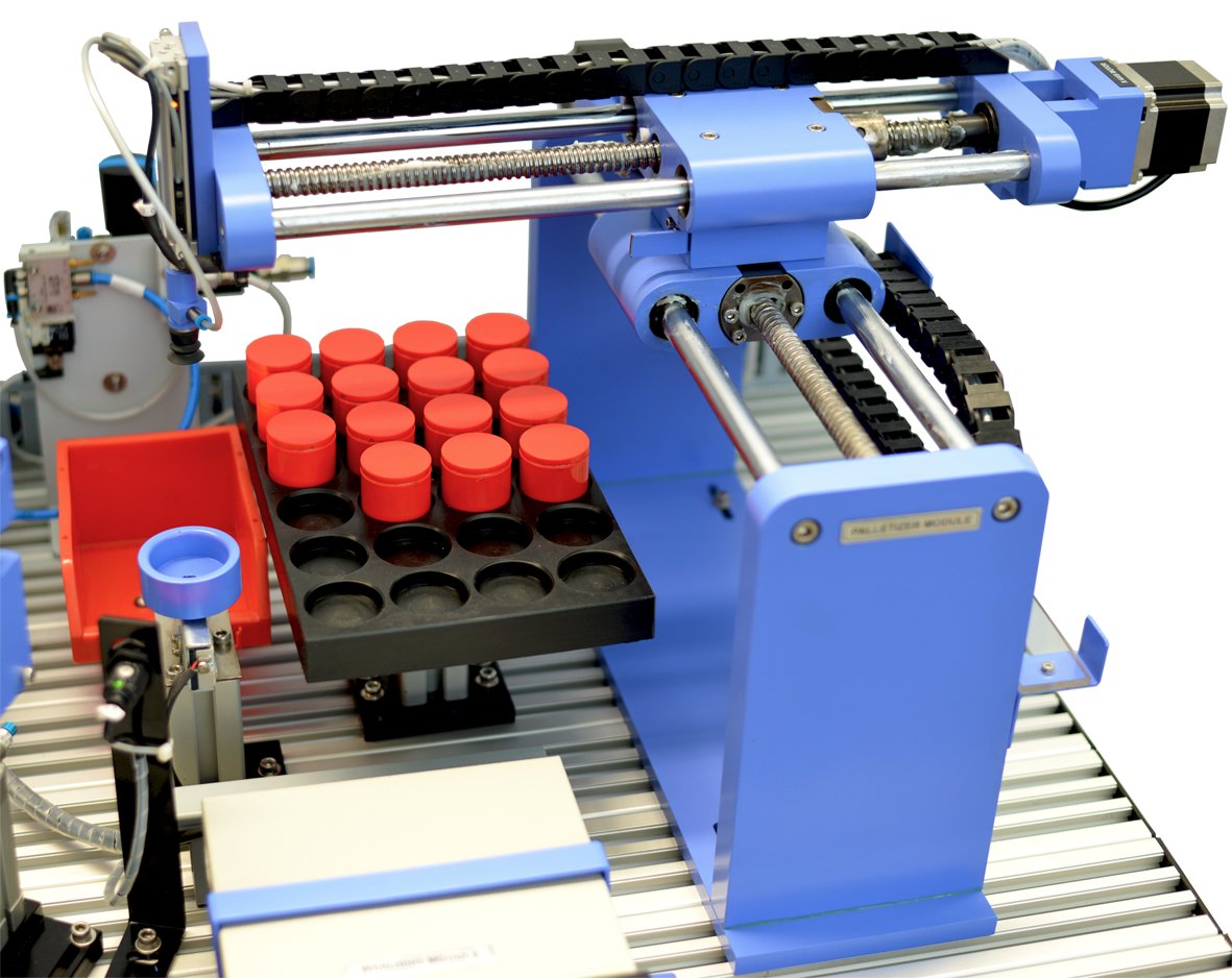 The functionally of the APS is to allow students to study the automation process and to understand how to control various modules to ensure they work together. The APS uses a bottling plant as the process with containers being placed onto the conveyor belt. The presence/absences of a container is detected using sensors and if present the containers are moved to the linear conveyor system. The linear conveyor moves each container onto the two axis pick and place module where the pneumatic gripper of the transfer unit picks up the container and places it onto the indexing rotary table. The motorised rotary module will index the container through to the volumetric filling modules where the container is filled. The container is then capped at the capping module and the containers are transferred from the rotary module to the weighing module. Once weighing is complete the XY palletising module will store the finished item in the pallet section.