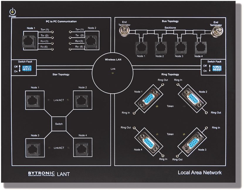 The Local Area Network Trainer provides the student with an understanding of the fundamentals of networking. Student gain a knowledge of the different network layers, cable design and the building of complete networks used in computing. The student can understand and implement various topologies using different IEEE standards. Connections can be made in different topologies and data can be transferred. Topics covered include the protocols and topologies used in networking, measurement of error rate, throughput and the effect of errors on protocols. The versatile software provided with the LANT will allow the student to observe the various effects and configurations on network along with the graphical representation.
