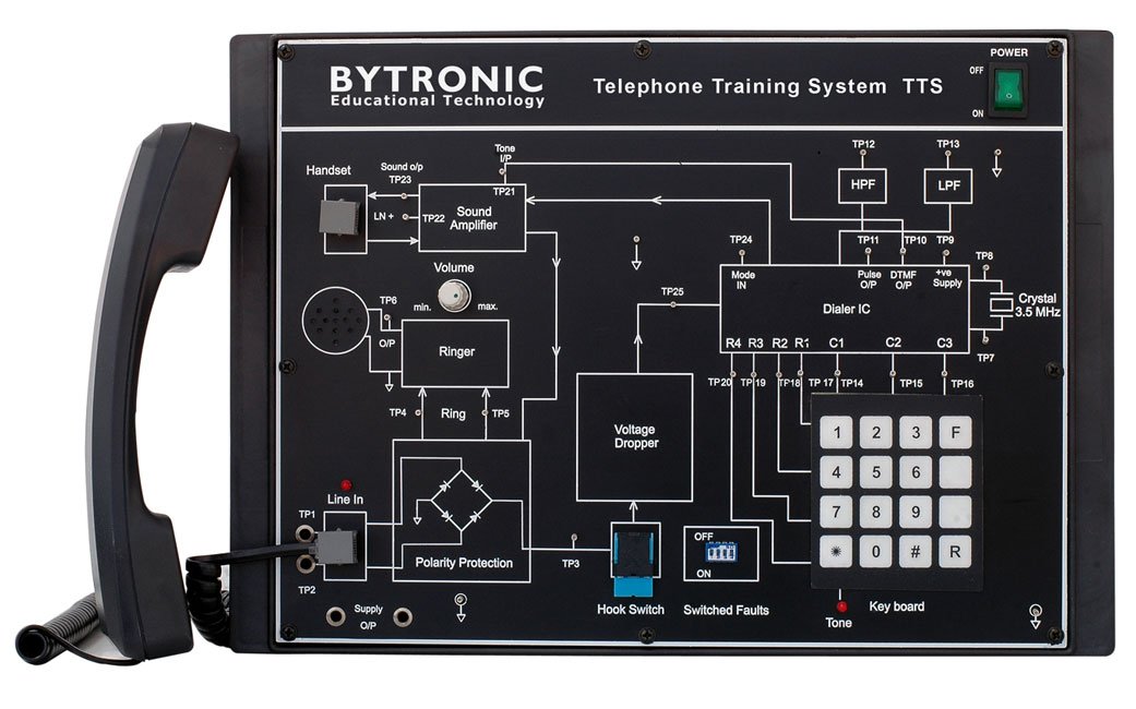The Telephone Training System (TTS) helps students to understand the basic concept and functional working of a Telephone system. An onboard mimic is provided that details the various blocks of a telephone and all components. Test points and LED’s are provided to allow students to observe various signals which helps them to understand the working of each block