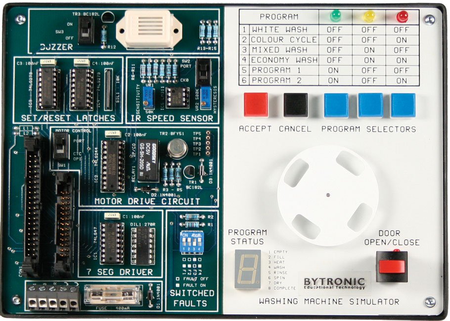 The Washing Machine Simulator (WMS) is an application for electronic control engineering. The unit incorporates a series of input and output devices, which together simulate the actions of a typical domestic washing machine. The WMS has two main areas. The first area comprises the electronic circuits and connector sockets, the second area is the indicators, a motorised disc (which represents the washing machine drum) and the user controls. The circuit board incorporates test points, a fuse and four switches for fault insertion.